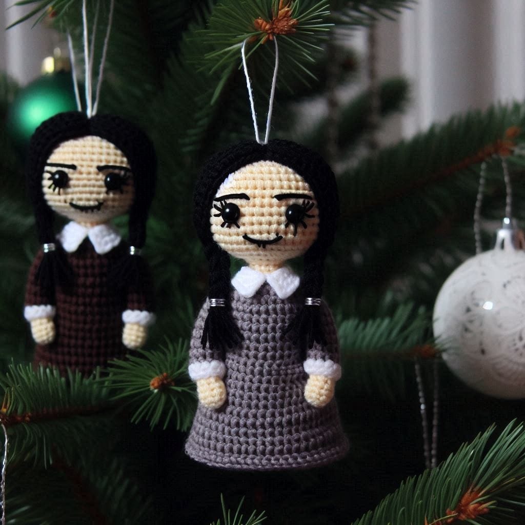 Celebrate the spooky charm of Crochet Wednesday Addams with this adorable crochet ornament. Perfect for adding a unique and gothic touch to your holiday decor.