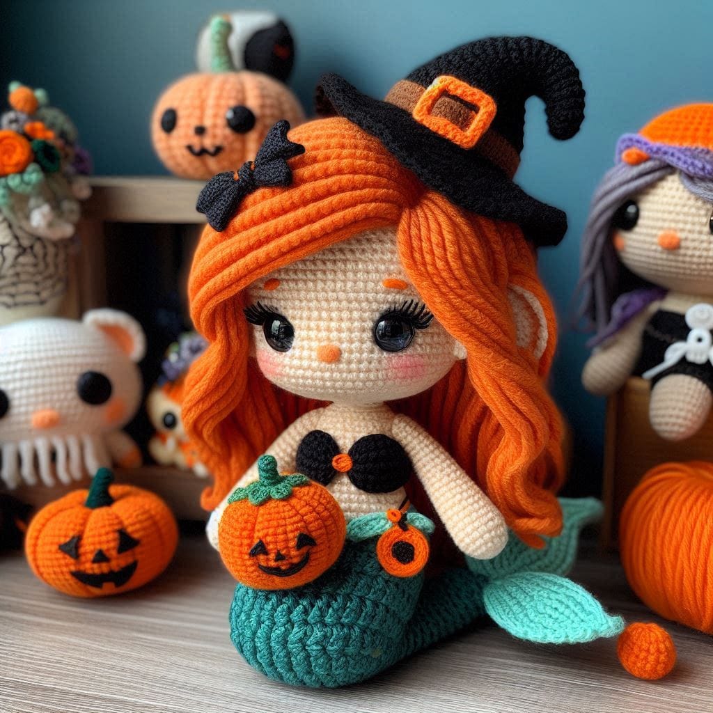 The Halloween mermaid amigurumi is made using basic crochet techniques, with detailed attention given to the festive details, including her flowing hair, witch hat, and mini pumpkin. Follow this crochet pattern to create your very own Halloween-inspired mermaid.